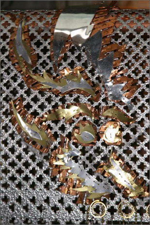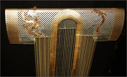 The aluminum shoulder piece is adorned with an appliqué of copper, and brass depicting the head and tail of a dragon.
